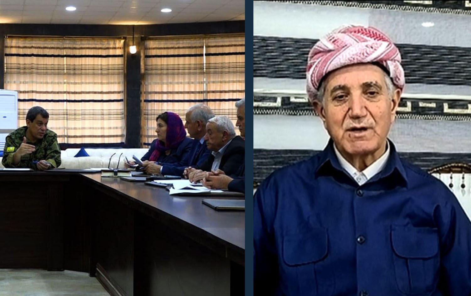 Last PYD-ENKS meeting (left) and ENKS President Mohammed Ismail speaking to Rudaw on March 22, 2025. Graphic: Rudaw
