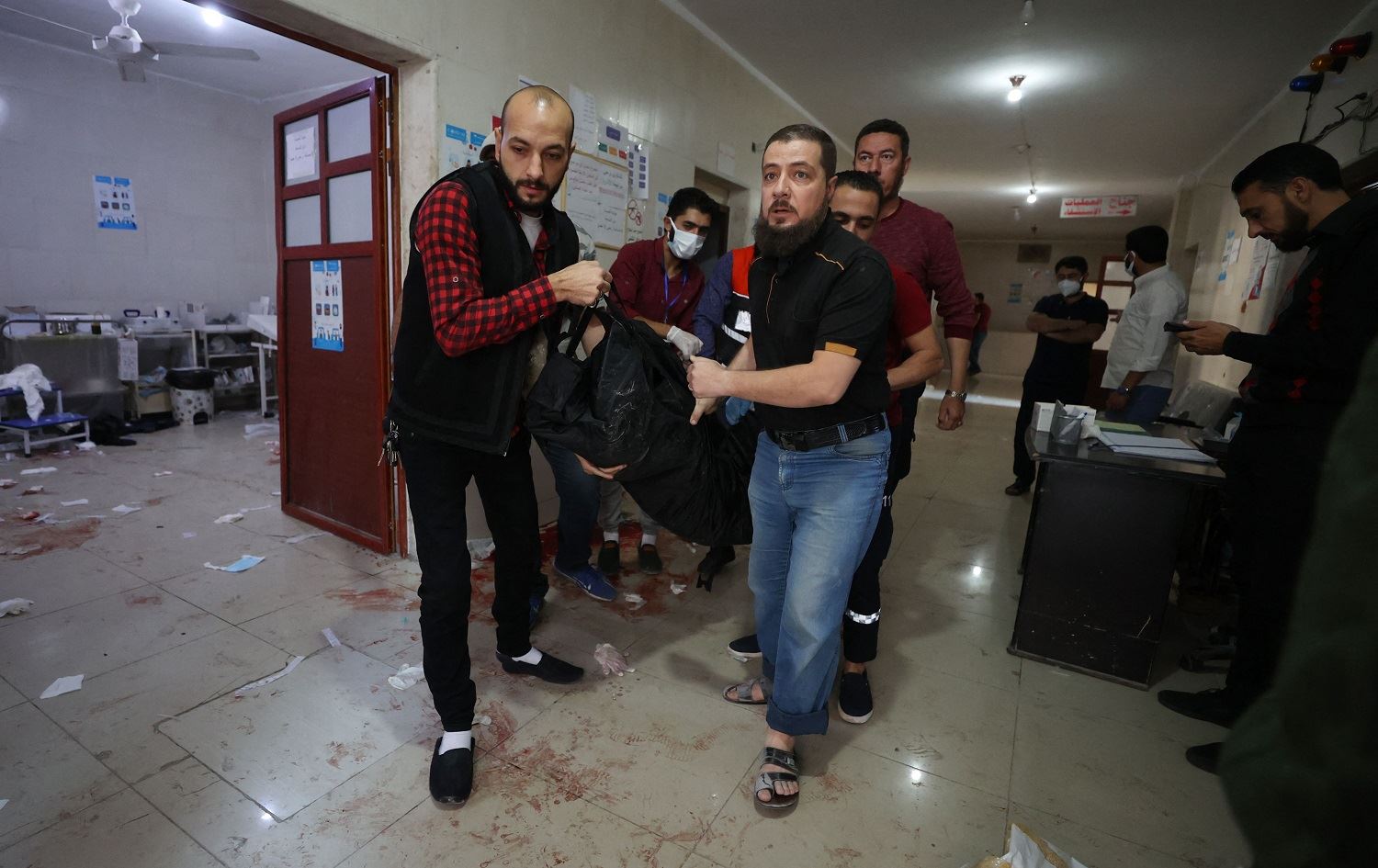 Syrians carry a body in a hospital in Ariha, Idlib on October 20, 2021. Photo: Omar Haj Kadour/AFP