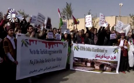 ERBIL, Kurdistan Region — A number of demonstrators held olive branches in front of the UN compound in Erbil on Tuesday protesting the Turkish army’s assault on the Kurdish city of Afrin, demanding the organization speak up and help stop it.