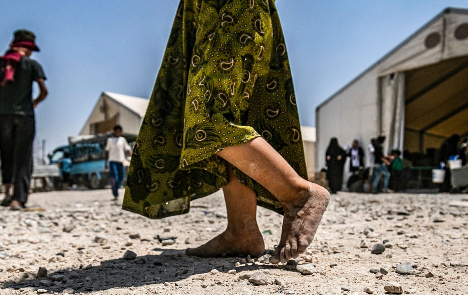 A young child walks barefoot at al-Hol camp in Hasaka, northeast Syria, on July 22, 2019. Photo: AFP