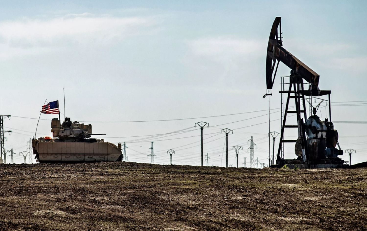 A US Bradley Fighting Vehicle patrols near oil production facilities in the Hasakah countryside February 2, 2021. Photo: Delil Souleiman/AFP