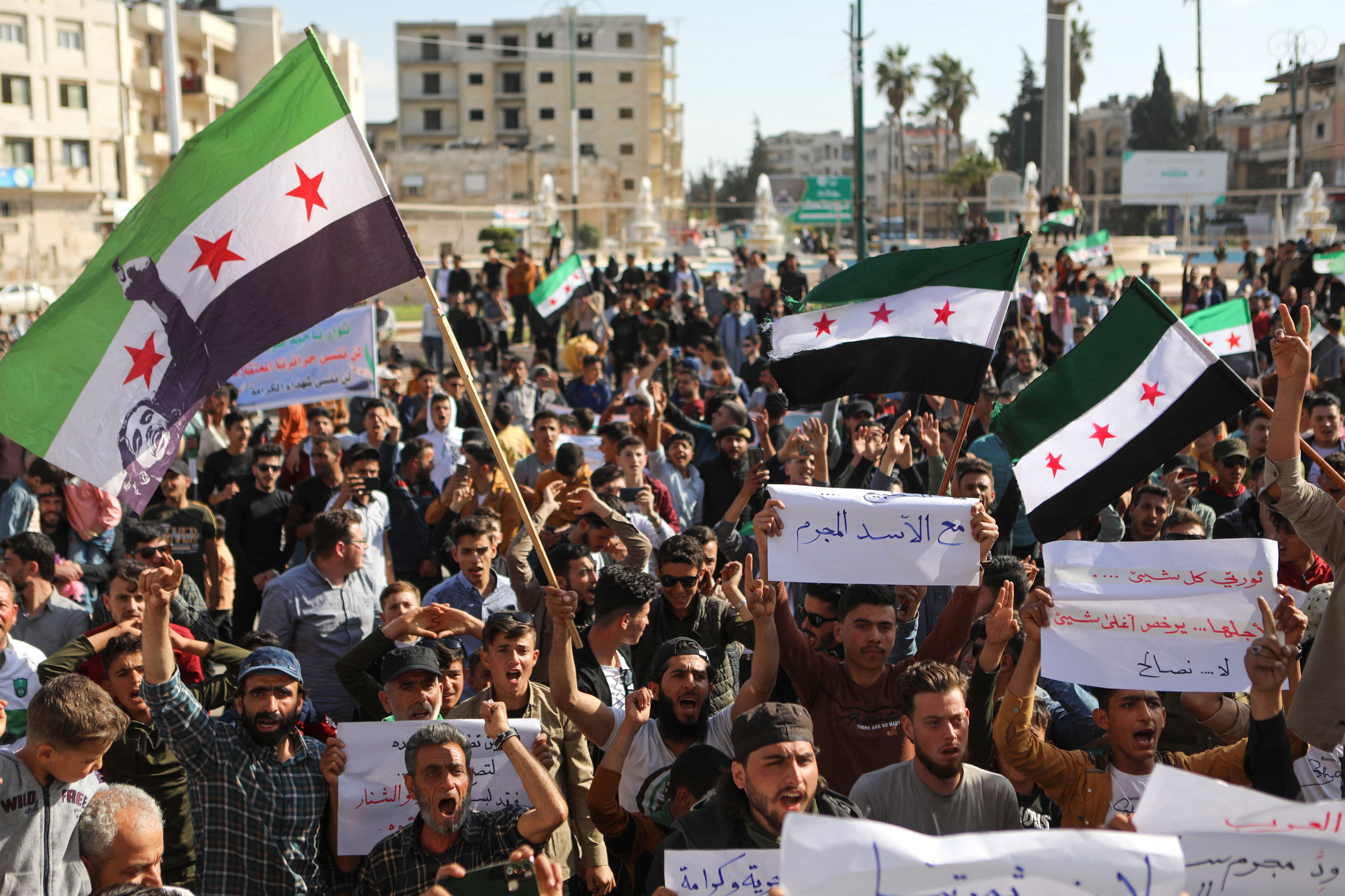 Syrians demonstrate in the rebel-held northwestern city of Idlib on April 23, 2023, against a thawing of ties between several Arab countries and President Bashar al-Assad's regime. Photo: Aaref Watad/AFP