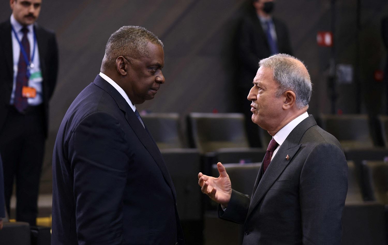 US Secretary of State for Defence Lloyd Austin (left) and Turkish Defence Minister Hulusi Akar (right) speak at a NATO Defence Ministers meeting in Brussels on October 22, 2021. Photo: Kenzo Tribouillard/AFP