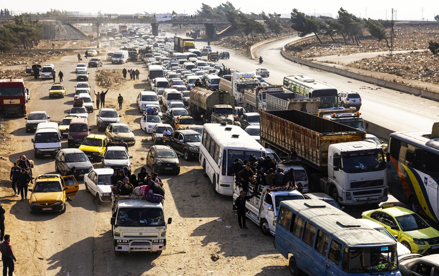 Vehicles leaving Damascus following the collapse of the Bashar al-Assad regime, on December 8, 2024. Photo: Ugur Yildirim/AP