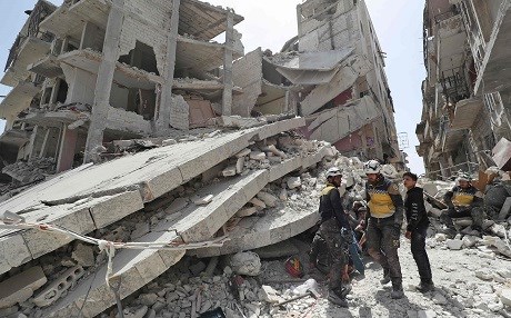Members of the Syrian Civil Defence (White Helmets) search the rubble of a collapsed building following an explosion in the town of Jisr al-Shughur, Idlib, on April 24, 2019. Photo: Omar Haj Kadour/AFP