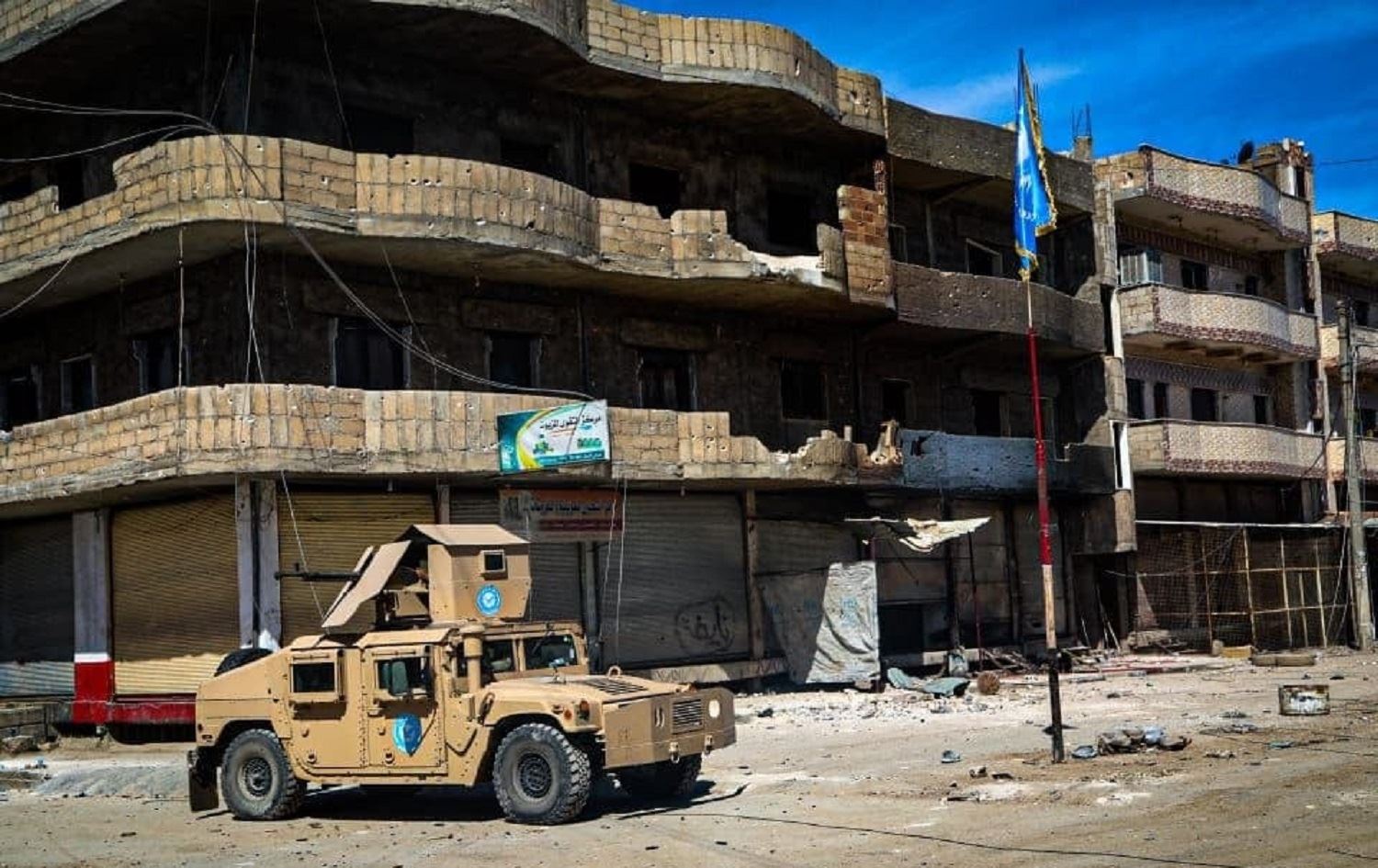 A vehicle and flag of the Kurdish security forces (Asayish) are seen in the al-Tai neighbourhood of Qamishli on April 24, 2021. Photo: handout/Asayish