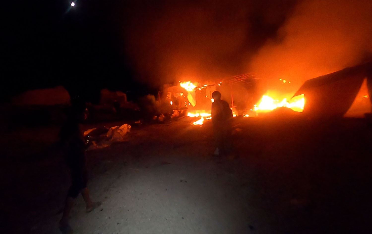 A camp on the near Sarmin, Idlib on fire after an alleged Syrian government rocket attack struck the facility, killing two civilians, on September 23, 2023. Photo: White Helmets