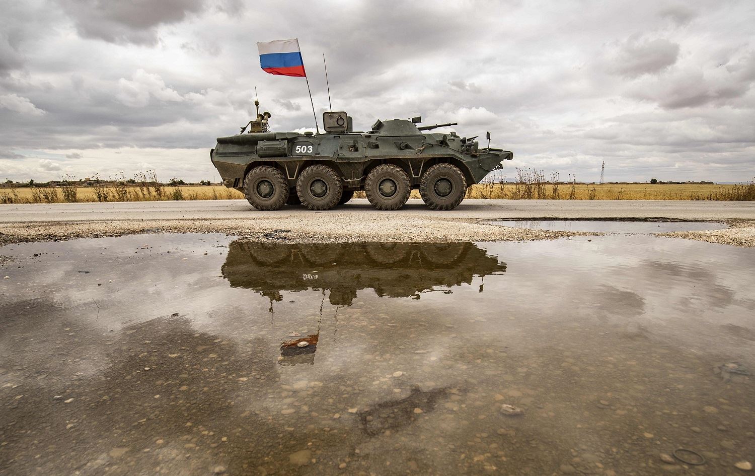 A Russian military vehicle drives along the M4 highway near the town of Tel Tamir, May 25, 2020. Photo: Delil Souleiman / AFP