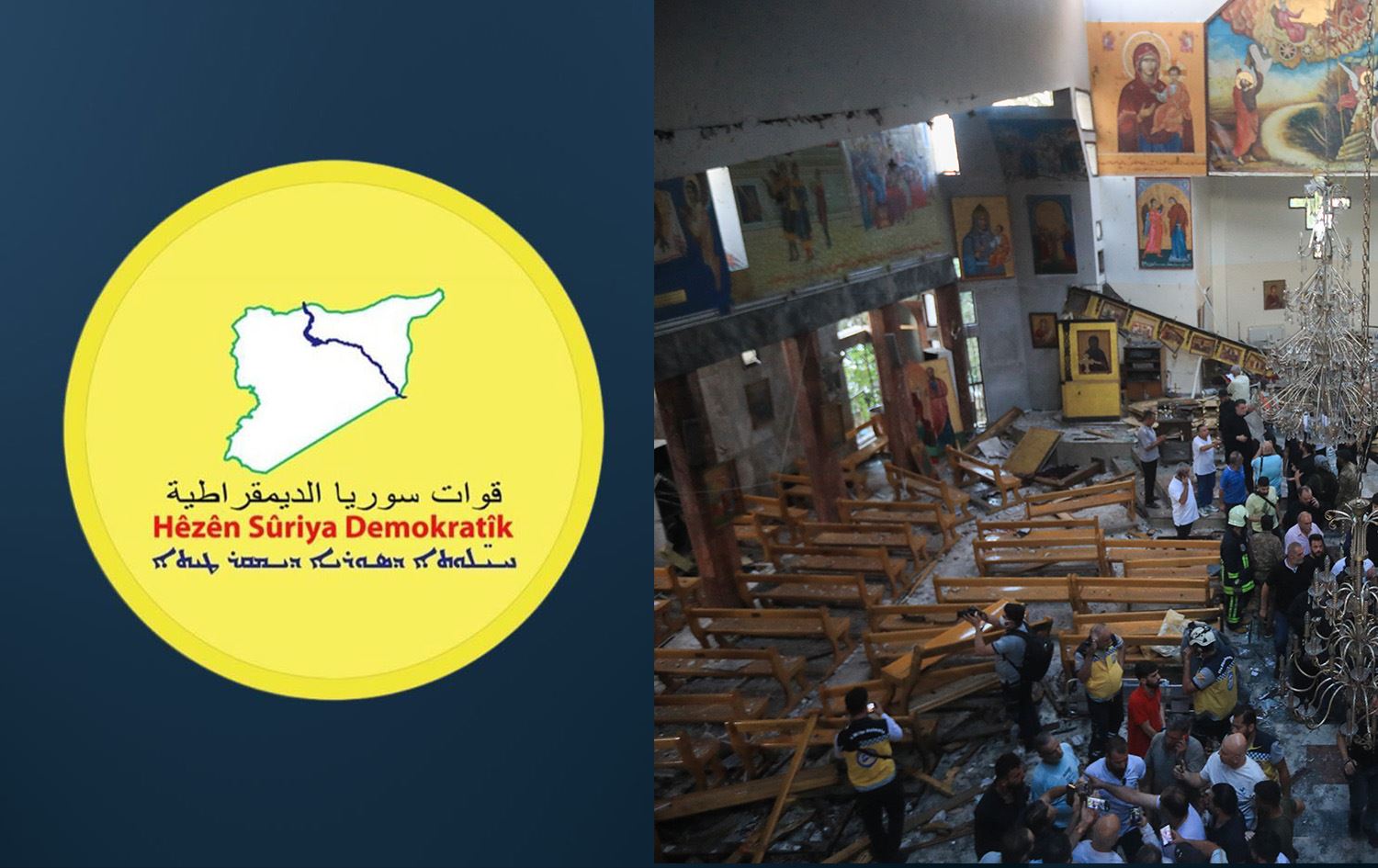 SDF logo (left) and aftermath of bombing at a church in Damascus (right) on June 22, 2025. Photo: AFP. Graphic: Rudaw