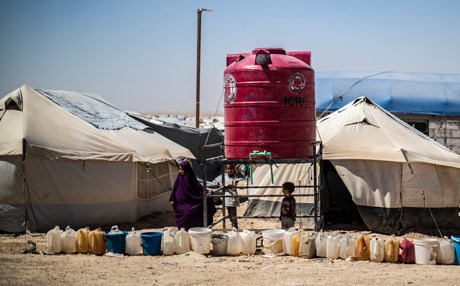 Between endless rows of white tents in al-Hol, children fill jerry cans with water from a tank provided by the Kurdish authorities.