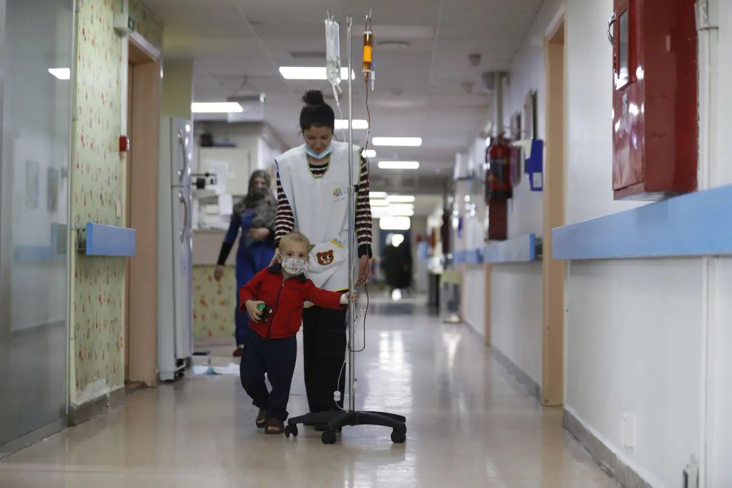 A child walks with a nurse at the cancer ward of the Children's Hospital in Damascus, Syria, Monday, March. 7, 2022. Photo: AP