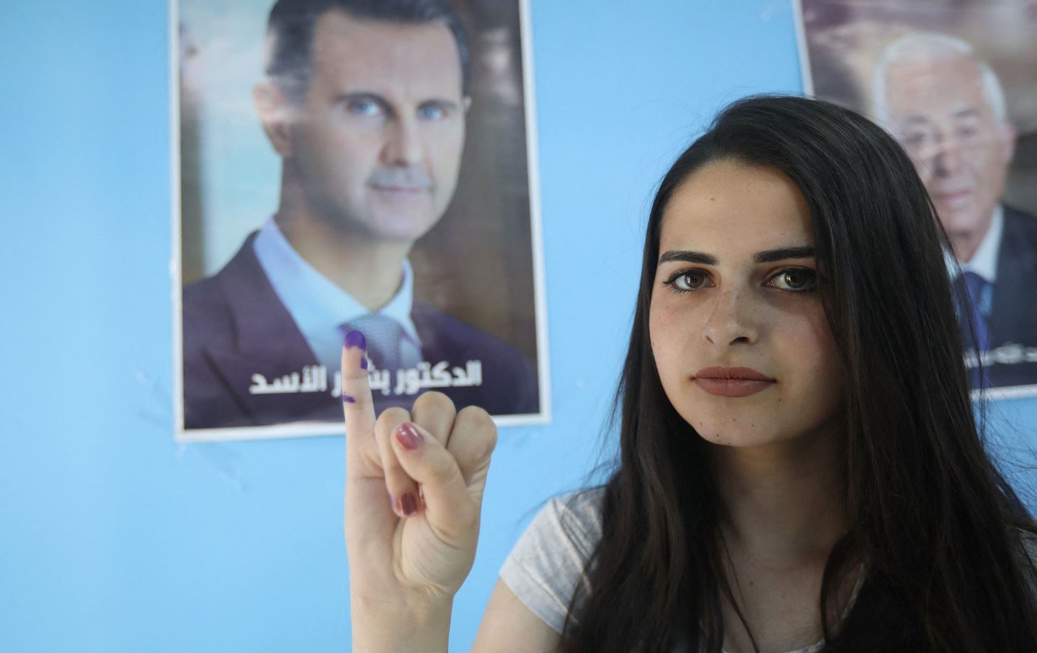 A Syrian voter, standing under a portrait of President Bashar al-Assad, shows her inked finger after voting at a polling station in Damascus on May 26, 2021. Photo: Louai Beshara/AFP