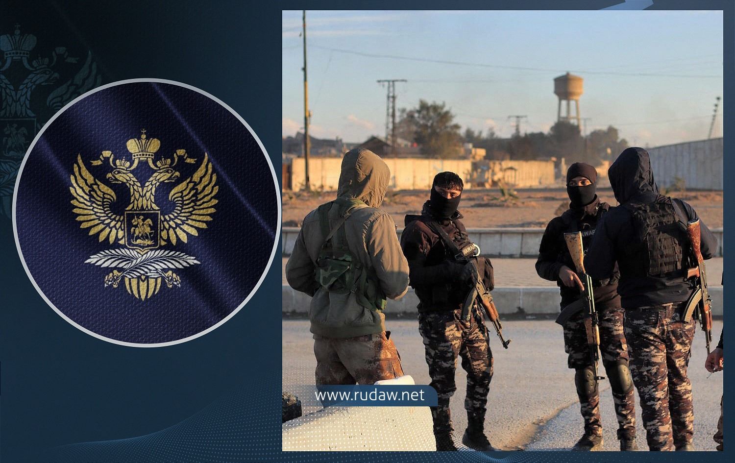From left: Logo of Russian foreign ministry, and a group of SDF fighters guarding al-Sina'a prison on January 25, 2022. Photo: AFP. Graphic: Rudaw