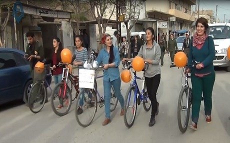 A group of young women held a symbolic bike ride in the city of Amuda in Syrian Kurdistan, demonstrating against norms that see girls on bikes as immodest. Under the slogan “free community,” the girls, who call their group Newroz, or New Day, said they want to be able to ride their bikes anywhere they like.