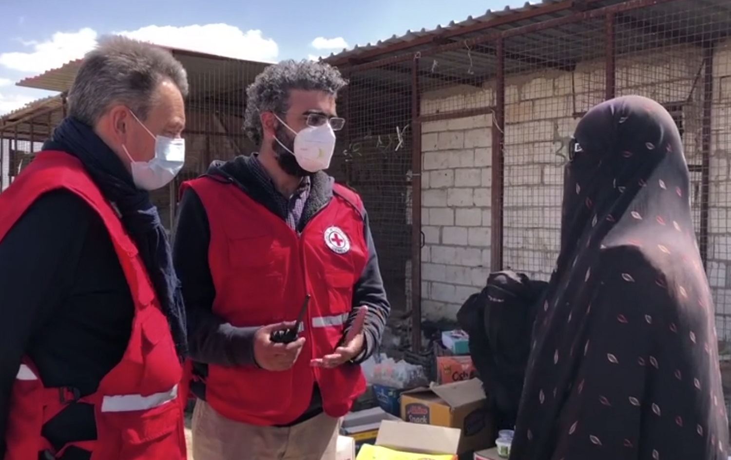 Peter Maurer, president of the International Committee of the Red Cross (ICRC), left, speaks with a woman in Syria’s al-Hol camp, in a screengrab taken from video published on March 26, 2021. Photo: screengrab/ICRC video