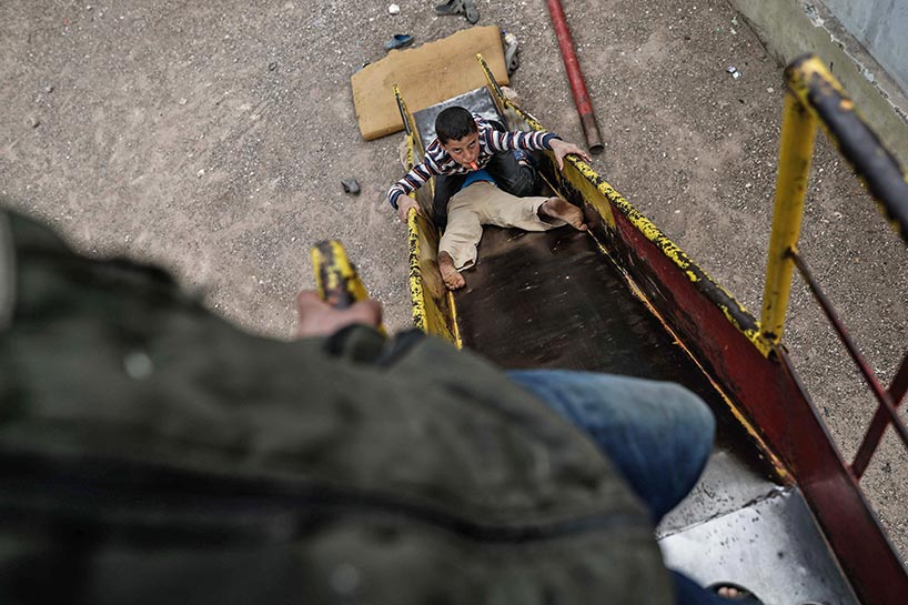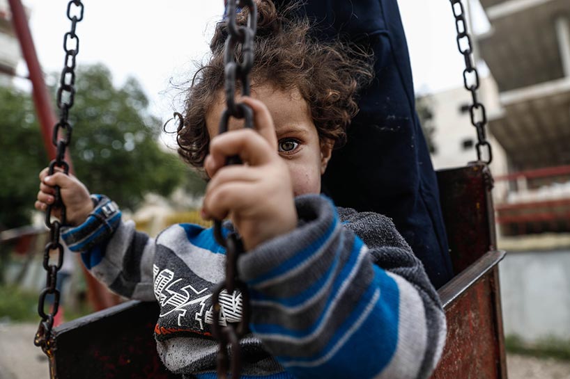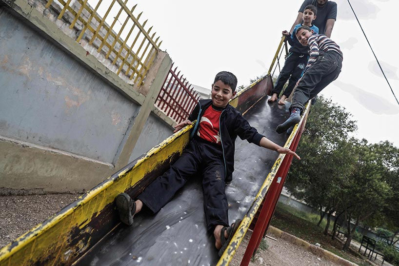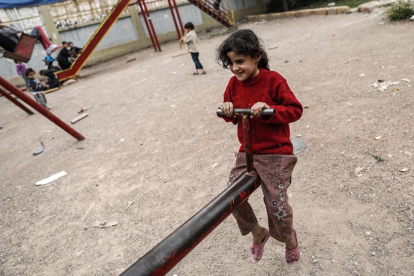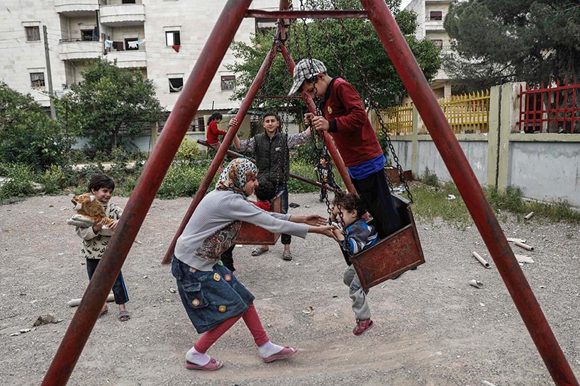 Young children swing on playgrounds next to rubble.