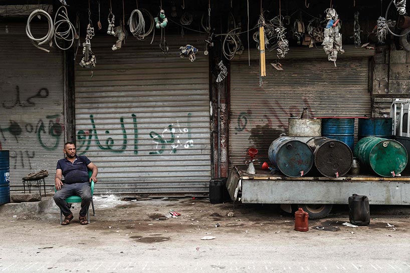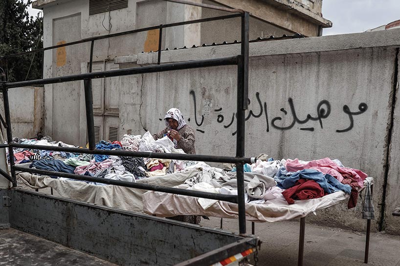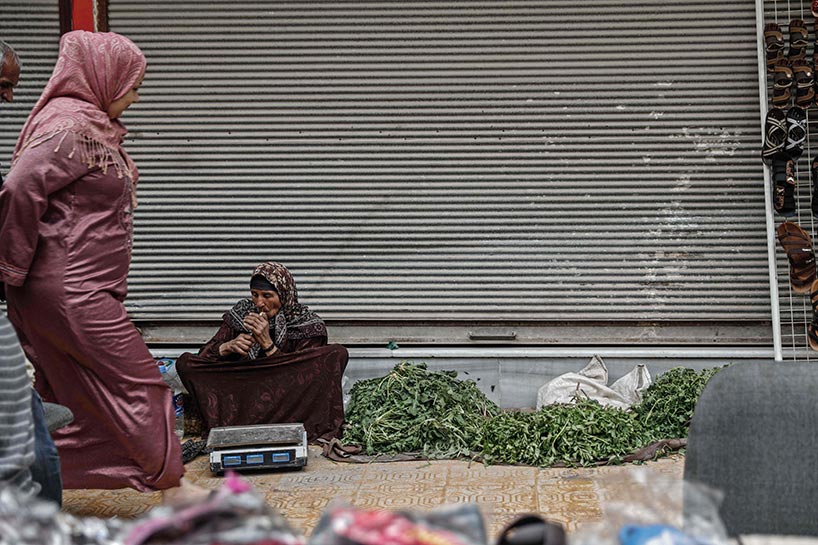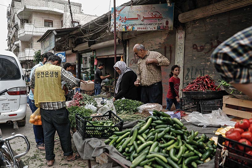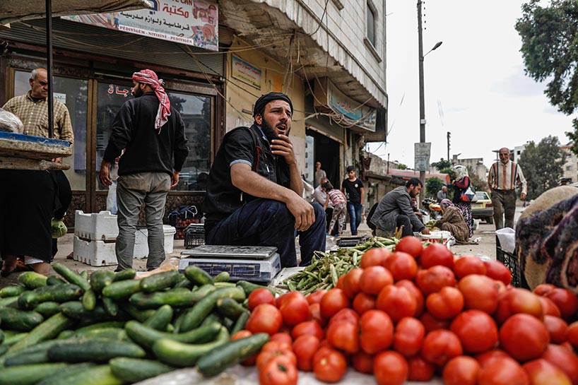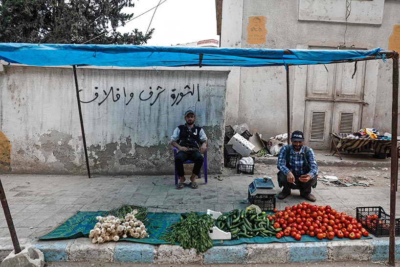 Vendors sell cucumbers, tomatoes, and other fresh vegetables at makeshift markets wherever they can find space in the bombed-out city.