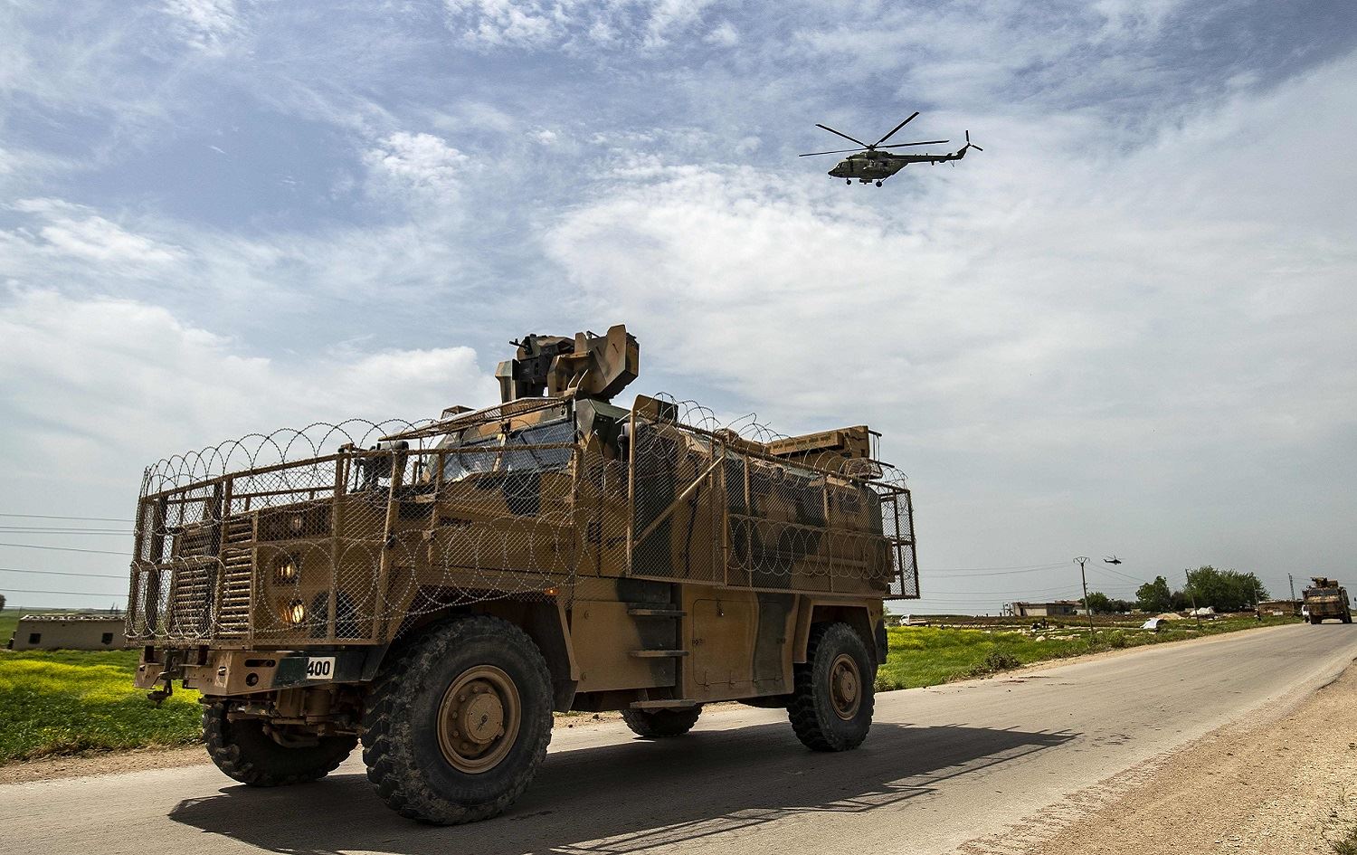 A Turkish military vehicle is accompanied on patrol by a Russian air force helicopter near Darbasiyah, northern Syria, April 22, 2020. Photo: Delil Souleiman / AFP