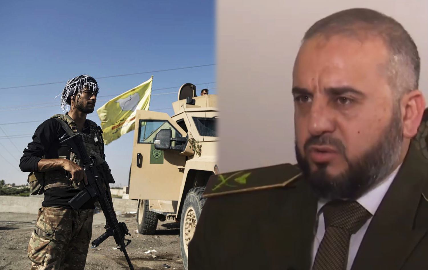 Syrian Defense Minister Murhaf Abu Qasra in an interview with the state-run al-Ikhbariya channel on May 26, 2025 (right). Photo: al-Ikhbariya/screengrab. An SDF fighter in Deir ez-Zor, eastern Syria in September 2023 (left). Photo: AFP