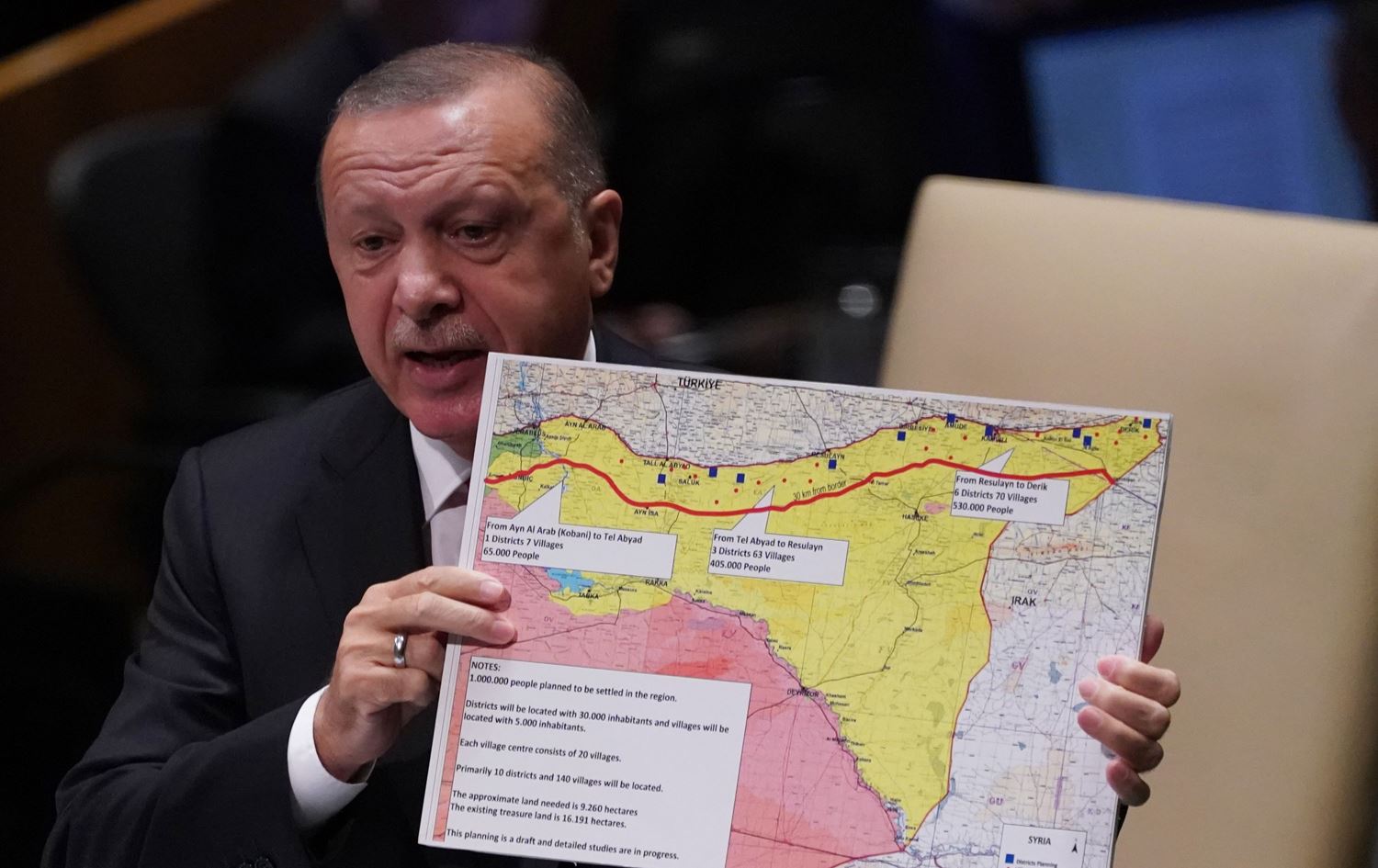 “We want to be able to resettle two million Syrians into the peace corridor with the support of the international community,” Erdogan told world leaders at the UN on Tuesday, holding up a map of the proposed safe zone that encompasses Turkey’s entire border with the Kurdish region of northern Syria.