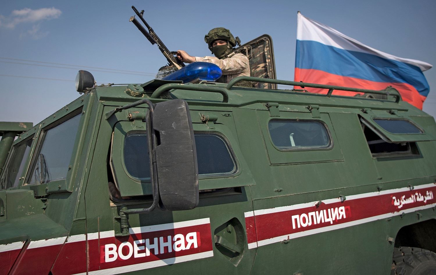 A soldier rides atop a Russian military vehicle near the northeast Syrian city of Qamishli, October 26, 2019. Photo: AFP