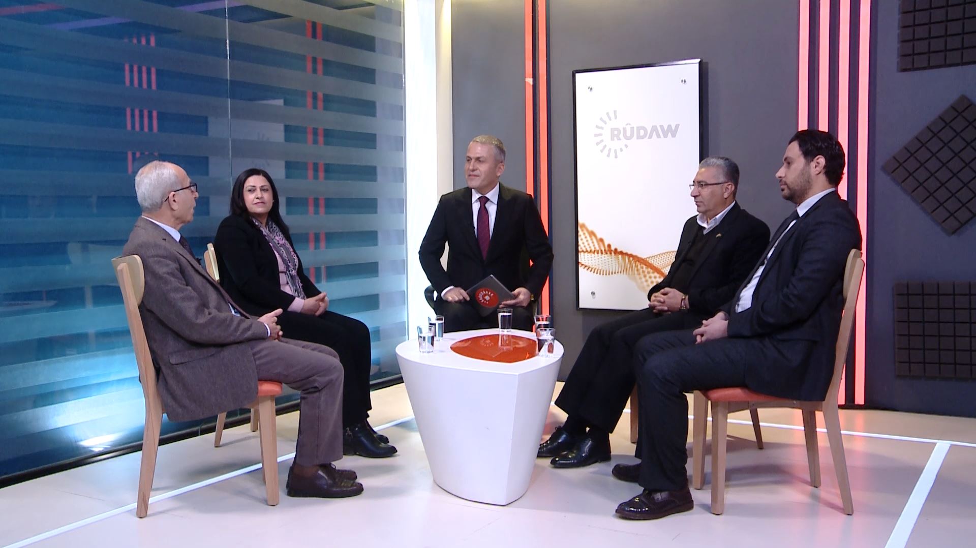 L-R: Gabriel Moushe Gawrieh, Amina Omar, Rudaw anchor Omar Kalo, Nashaat Zaza, and Sheikh Basman al-Assaf in Qamishli. Photo: Rudaw