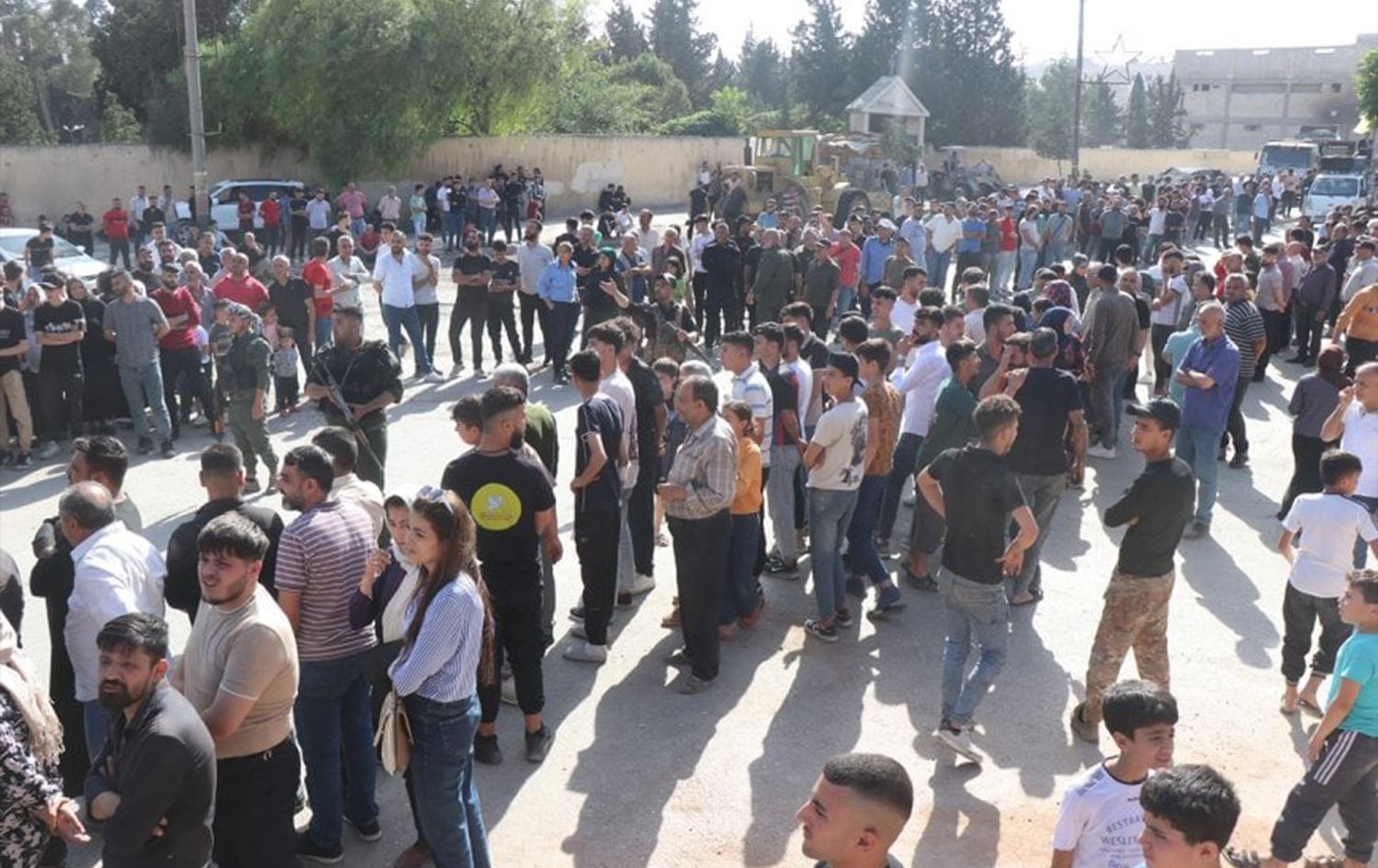 People gather in Syria’s northern city of Aleppo for a planned prisoner swap between the Kurdish-led Syrian Democratic Forces (SDF) and the Damascus administration on May 28, 2025. Photo: ANHA