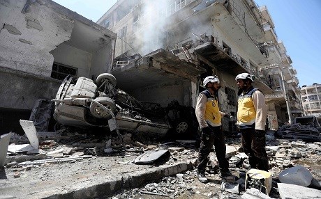Members of the Syrian Civil Defence (White Helmets) gather at the site of a reported air strike on the town of Ariha, in the south of Syria's Idlib province on July 28, 2019. Photo: Omar Haj Kadour | AFP