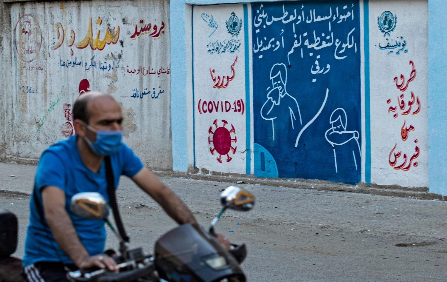 A man rides a motorbike past a mural painted as part of an awareness campaign by the United Nations International Children's Emergency Fund (UNICEF) and World Health Organization (WHO) intitative, bearing instructions on protection from COVID-19 in Qamishli, Syria on August 16, 2020. Photo: Delil Souleiman