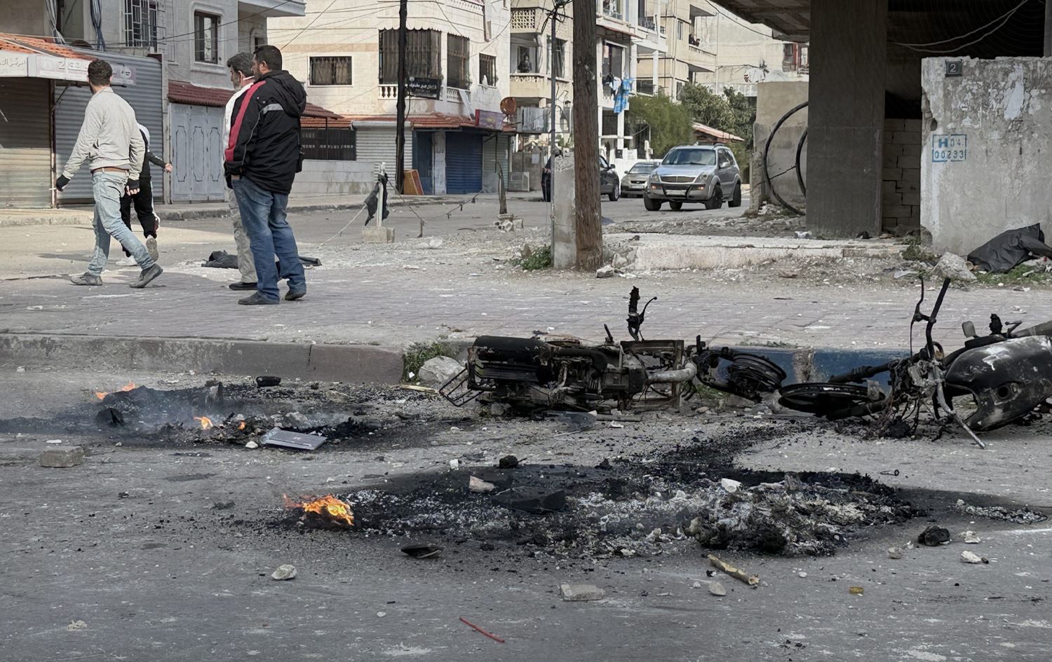 Residents standing close to a destroyed motorcycle on a street amid protests in Syria’s coastal areas: Photo: SANA