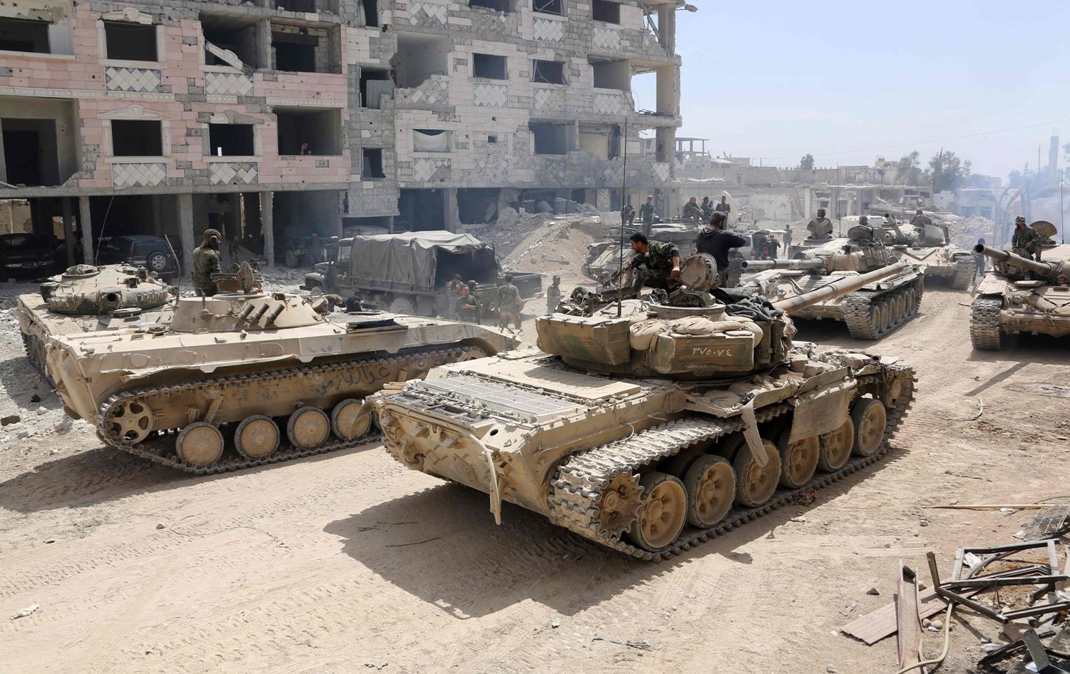 Syrian Army soldiers gather Sunday in an area on the eastern outskirts of Douma as they continue their force offensive to retake the last opposition holdout in eastern Ghouta. Photo: AFP