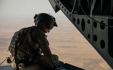 A Coalition Forces CH-47 Chinook crew member looks down from the sky during a transport mission in northeastern Syria, Jun. 22, 2019. Photo: Staff Sgt. Ray Boyington | US Army