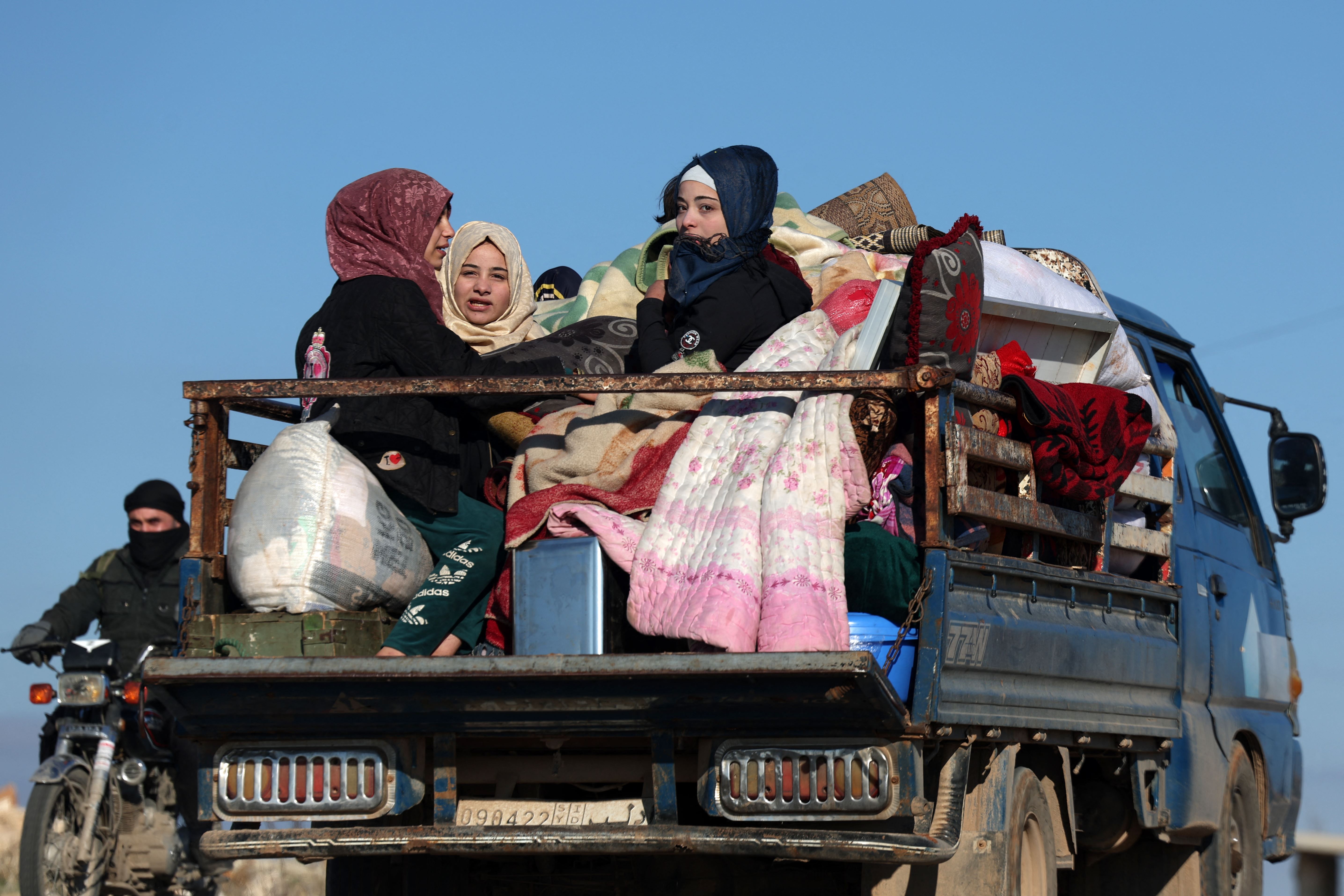 People flee the northern Syrian village of Ariha, during clashes and mutual shelling between Syrian jihadists and allied factions and regime forces on the front lines on the outskirts of the city of Saraqib in Syria's Aleppo province on November 28, 2024. Photo: AFP