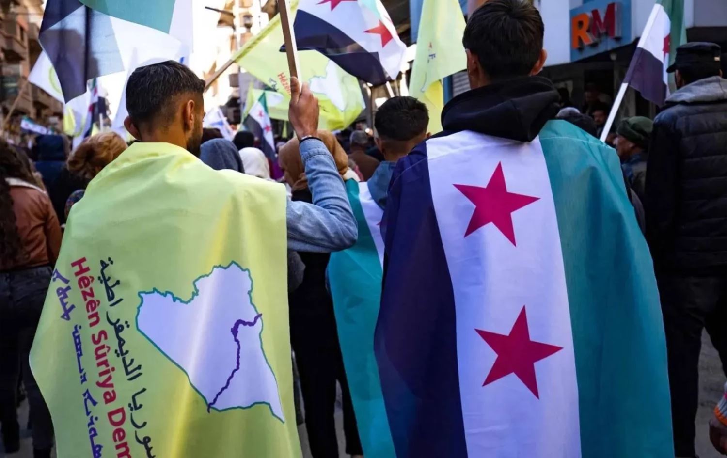 Two men carrying the SDF flag (left) and the Syrian flag (right) in the northeastern city of Qamishli, on December 19, 2024. Photo: Delil Souleiman/AFP