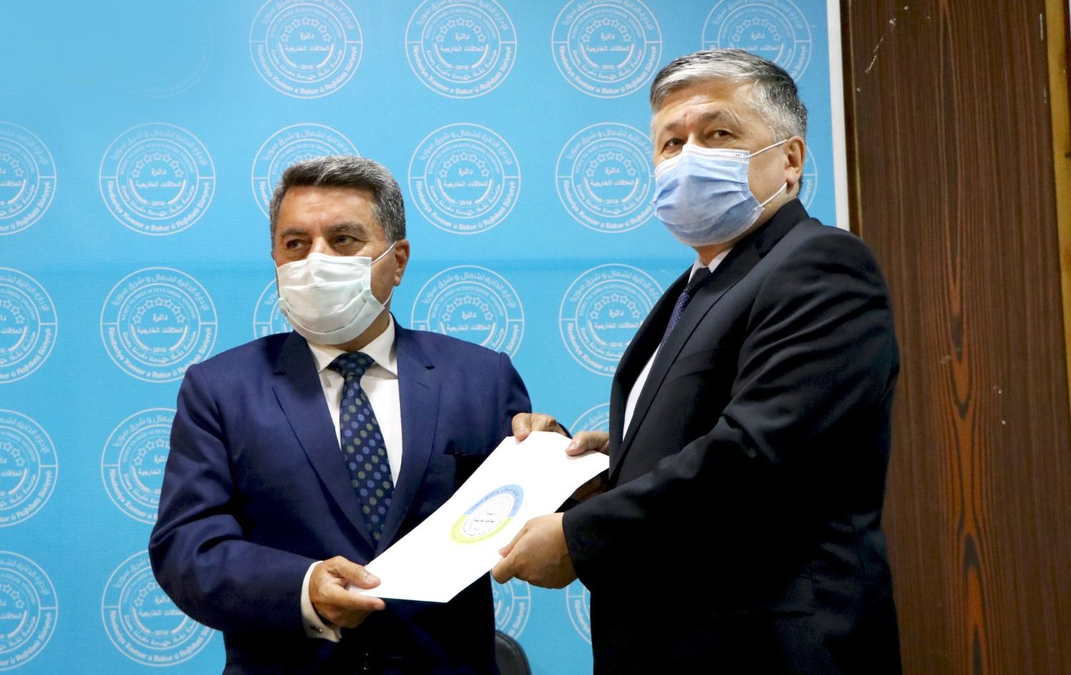Abdulkarim Omar (left), head of Rojava foreign affairs office, and Bahromjon Aloev (right), head of Uzbek delegation, pictured after agreeing on the repatriation of 92 Uzbekistan citizens on April 30, 2021. Photo: handout/Rojava foreign affairs office