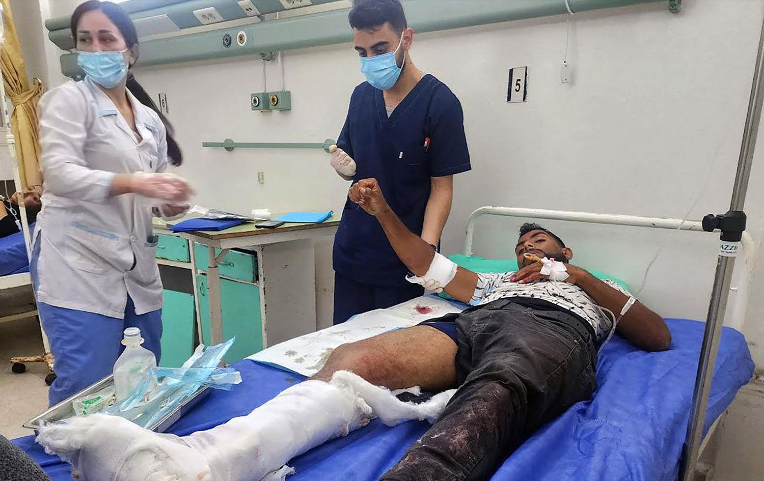 A handout picture released by the official Syrian Arab News Agency (SANA) on May 29, 2024 shows an injured man receiving medical care at a hospital in the coastal city of Baniyas, following what Syria's defence ministry said was an Israeli air strike. Photo: SANA/AFP
