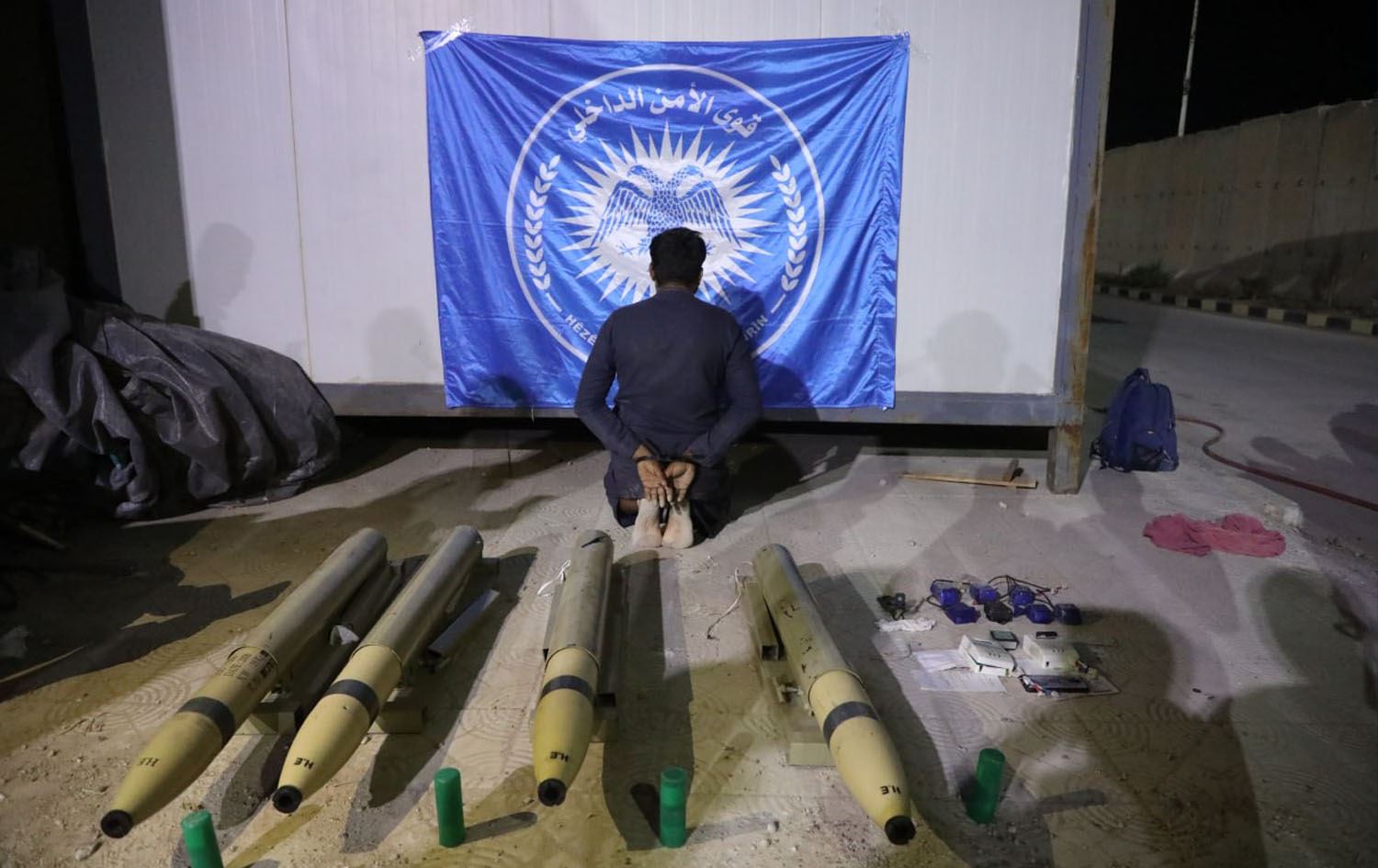 An individual apprehended by Rojava security forces, along with several rockets seized in the operation. Photo: Asayish