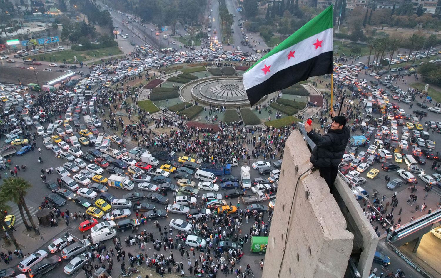 An aerial view shows a Syrian man waving the independence-era Syrian flag at Damascus' central Umayyad Square on December 11, 2024. Photo: AFP