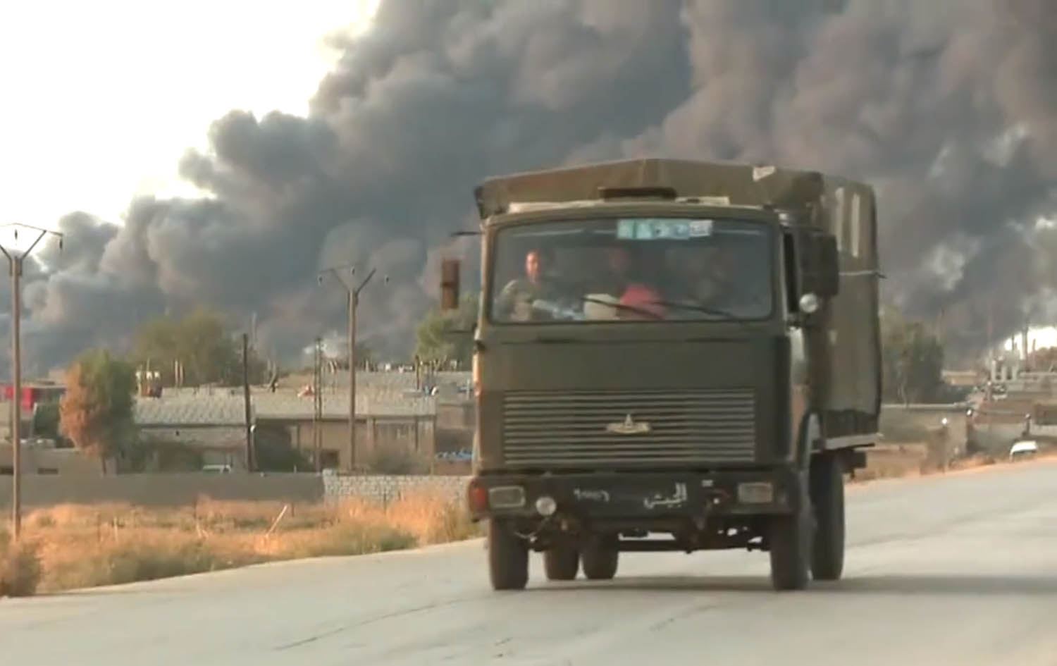 Syrian regime vehicles withdraw from Tel Tamr under attack by Turkish-backed militiamen, October 30, 2019. Photo: Rudaw TV