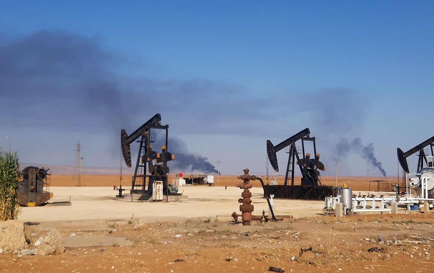 This picture shows pumpjacks in an oil field and smoke plumes rising in the background, following reported Turkish drone strikes near the town of Tirbespi (al-Qahtaniyah) in Syria's northeastern Hasakah province (Rojava) on November 23, 2022. Photo: Gihad Darwish/AFP