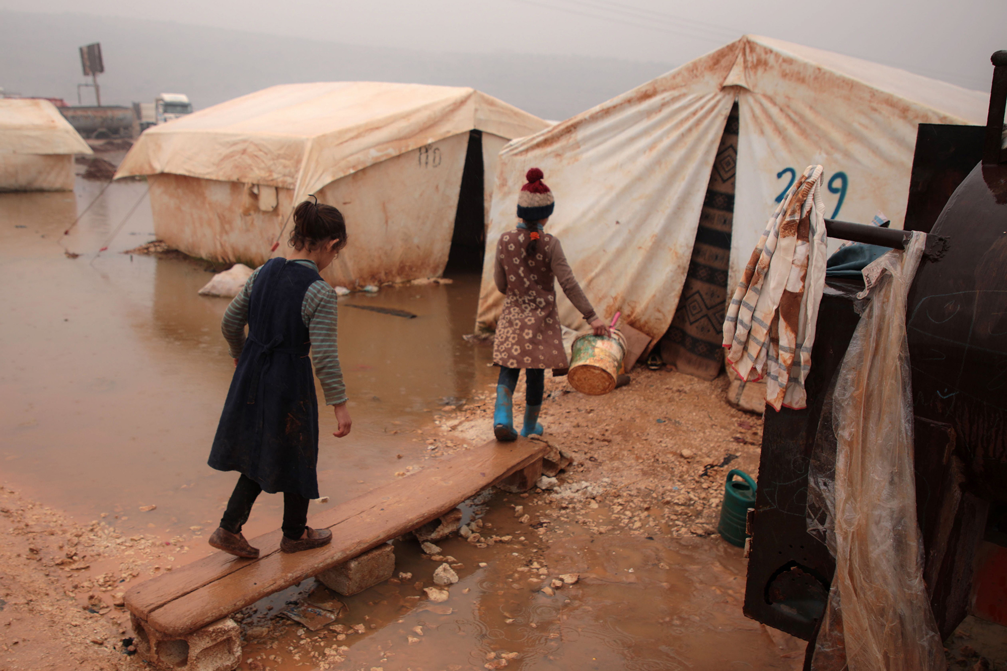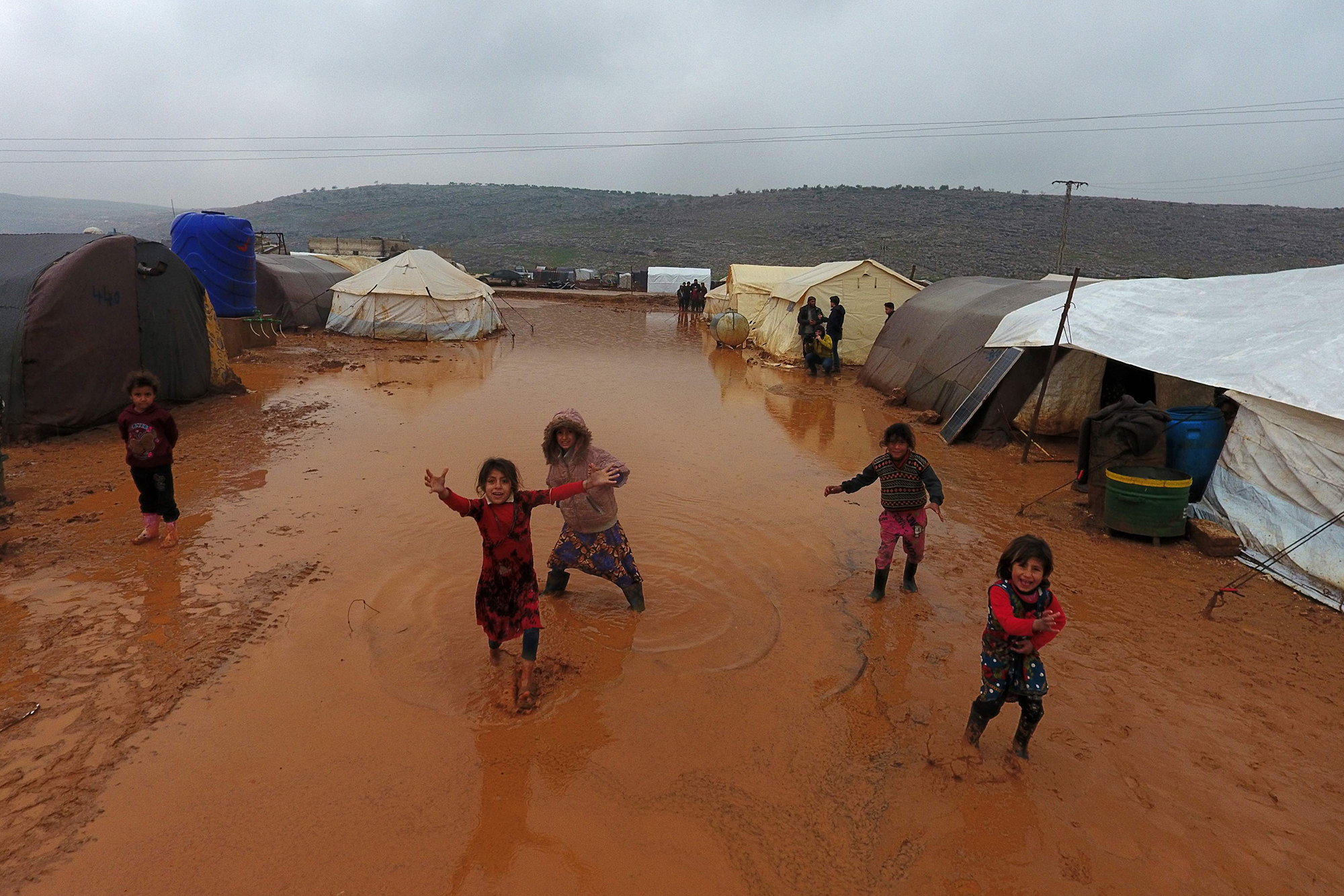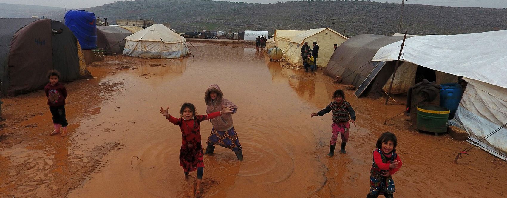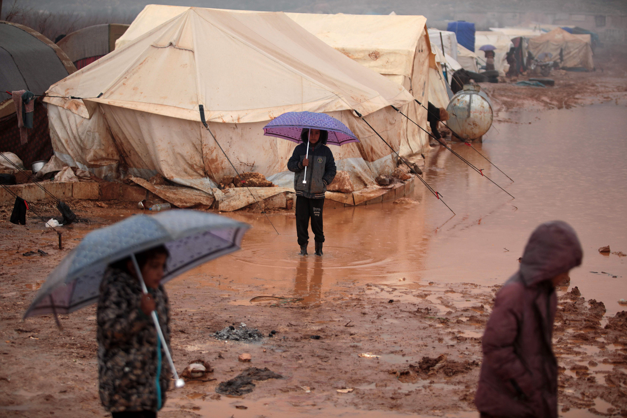 Syrians fleeing intense clashes between pro-regime forces and jihadists in the northwest province of Idlib now have to struggle to survive heavy rain on Syria-Turkey border, which has flooded the region.