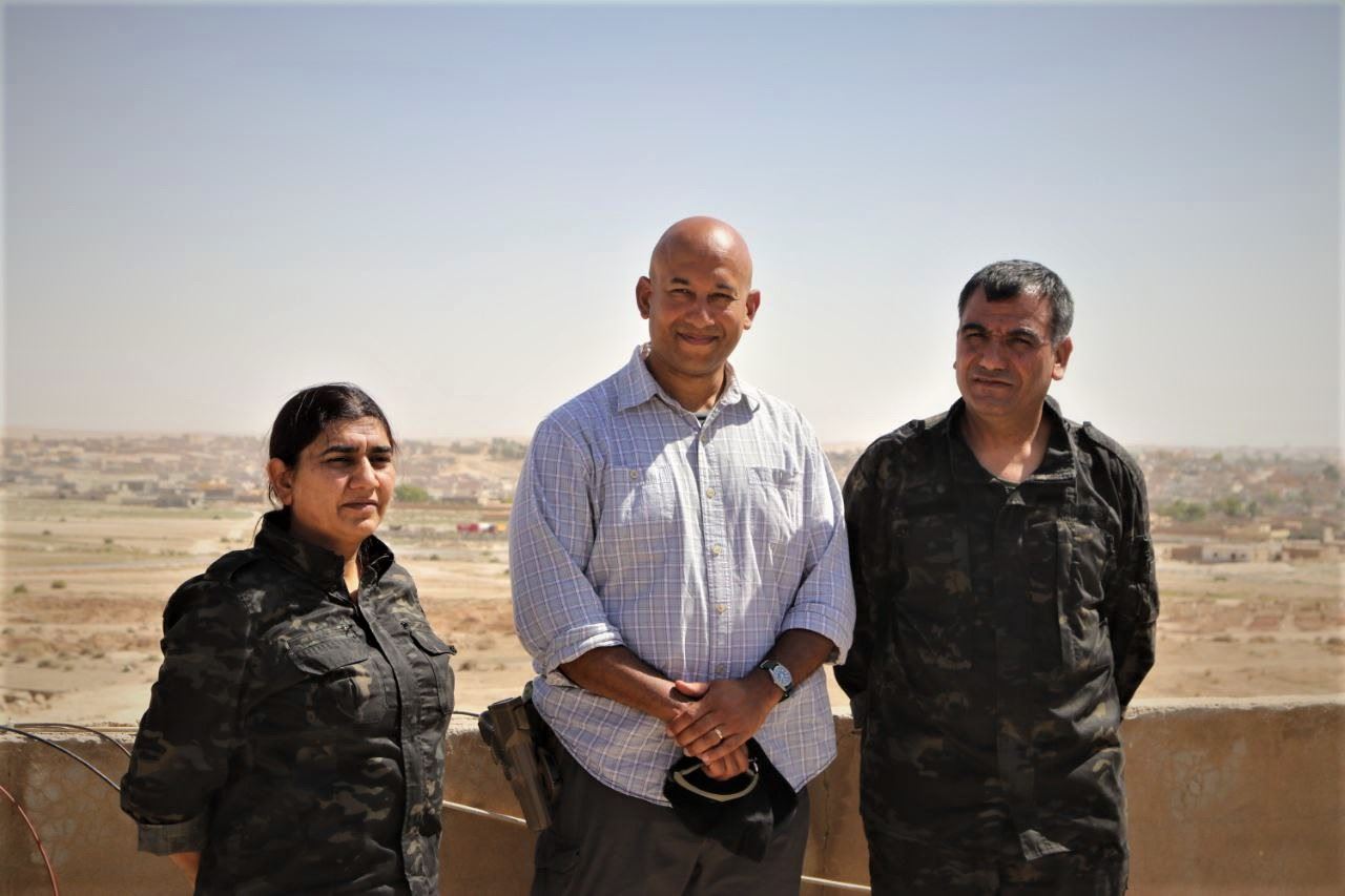 Mahmoud Barkhadan (right), a top SDF commander, received UK Brigadier Gen. Karl Harris (middle), deputy to the General Commander of CJTF-OIR, in Hasaka, Rojava on August 31, 2022. Photo: SDF