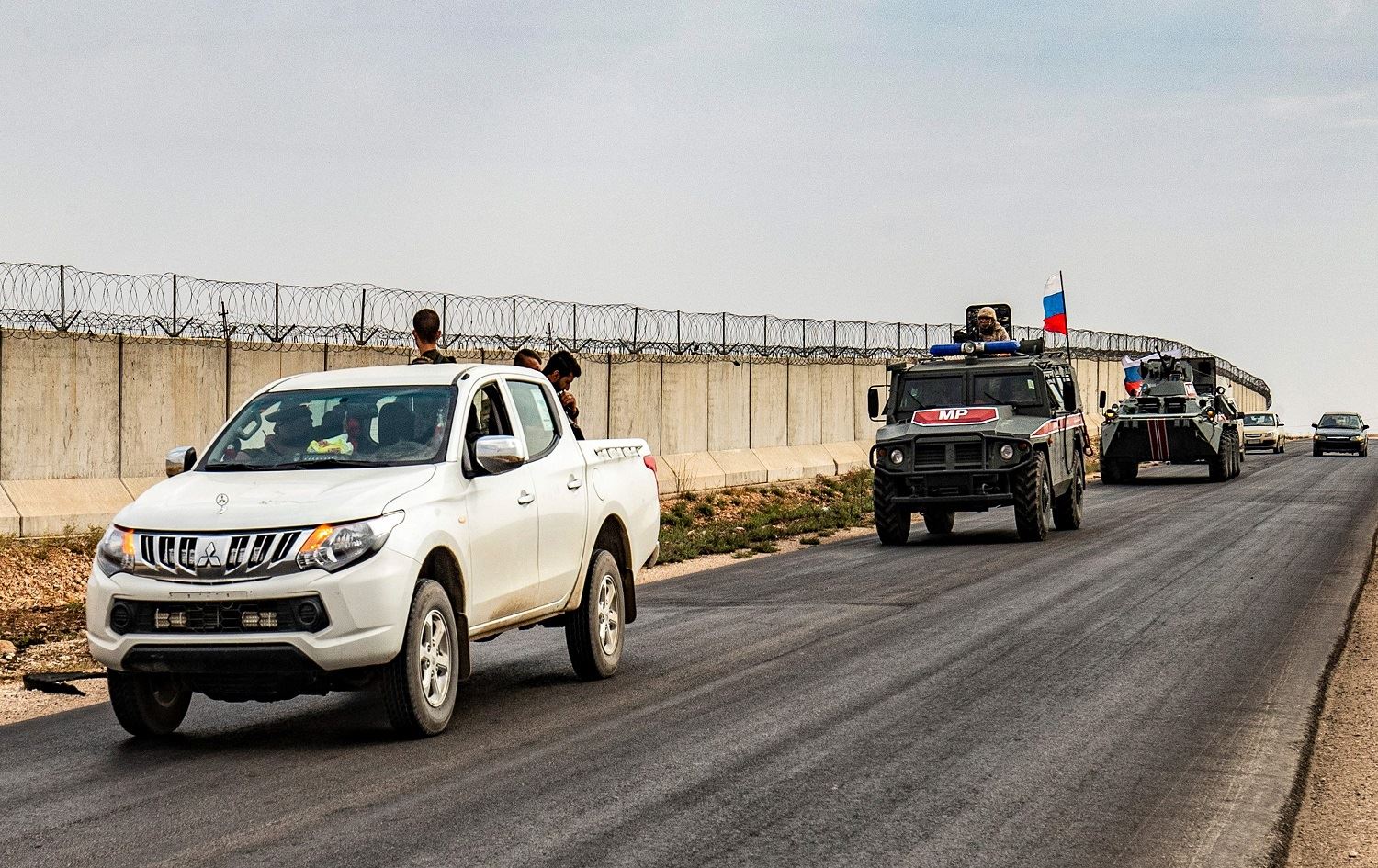 Members of the Syrian Kurdish Asayish internal security forces ride in the back of a pickup truck during a joint patrol with Russian military police vehicles ) along in Hasakah province on October 25, 2019 as part of a joint patrol near the border. Photo: Delil Souleiman/AFP