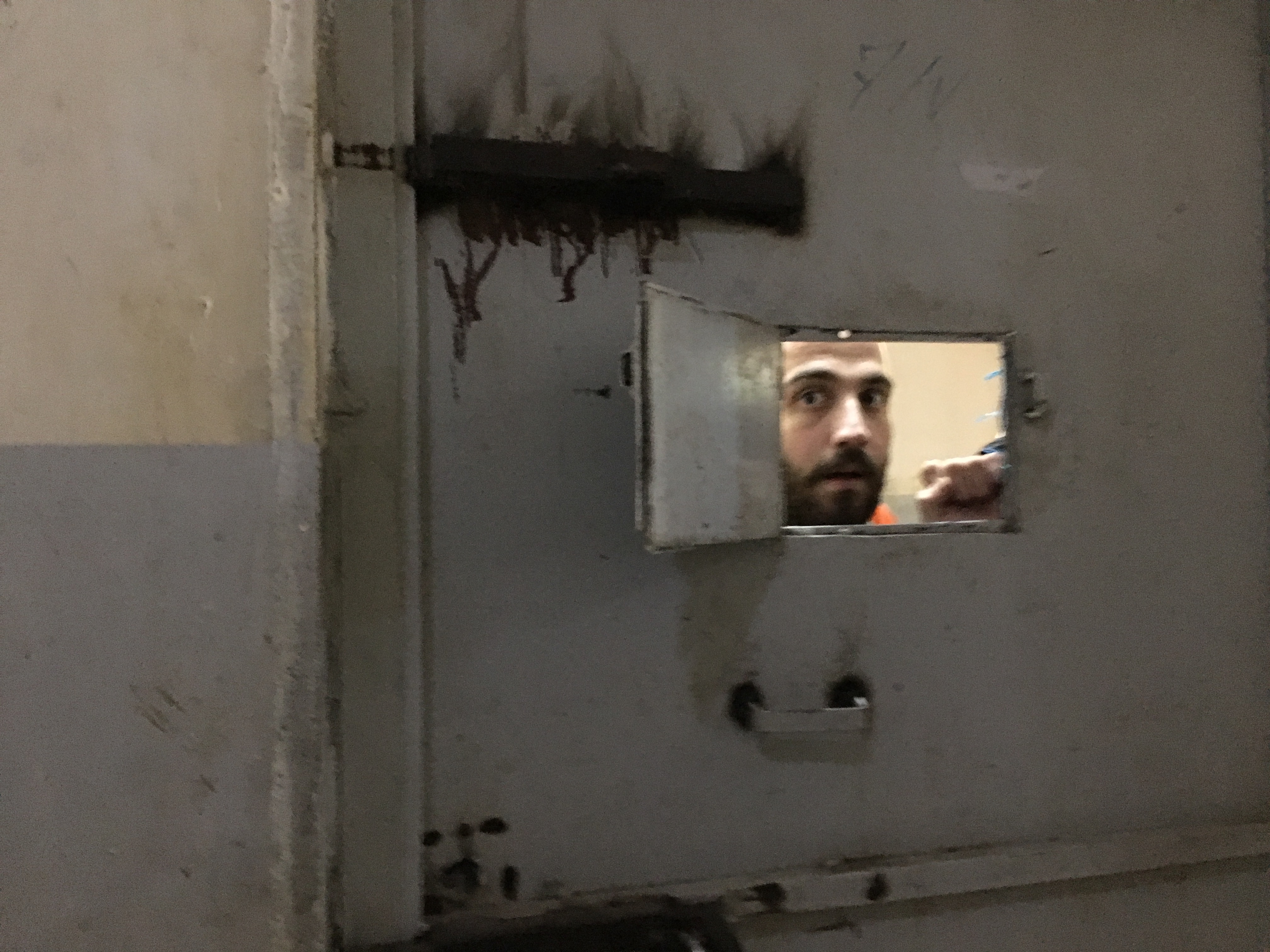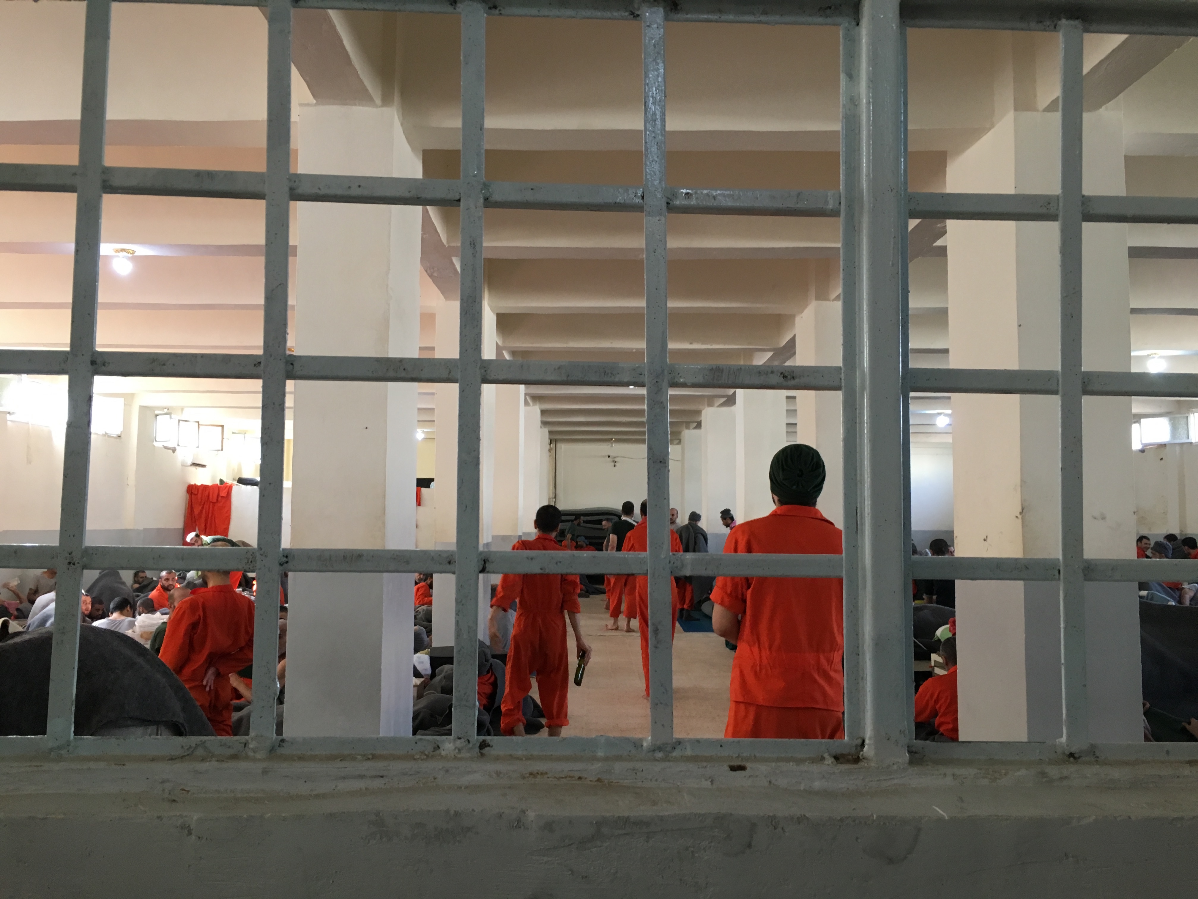 In late March, the prisoners managed to take control of entire sections of the prison in a riot that lasted for two days. Video released by prison authorities shows an unruly mob of more than 50 men in a common cell, pacing as if ready to riot. The concrete wall appears to buckle under the force of the sheer mass of bodies throwing their weight against it. Some batter at the door, some don masks to conceal their faces and attempt to cover the cell’s surveillance. Others hold up an improvised banner reading: “We call upon the coalition and international organizations that human rights be respected.” Others stand by motionless, crouching in the corner.
