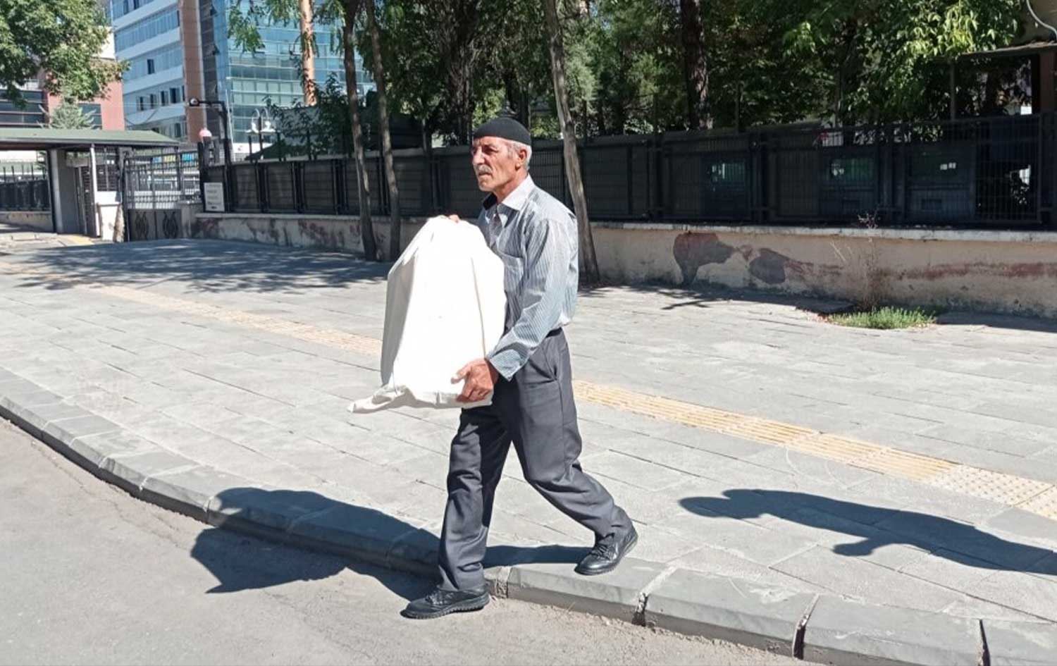 Ali Riza Arslan carries the remains of his son in a bag in front of courthouse in Diyarbakir on August 29, 2022. Photo: MA