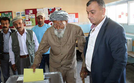 1:25 pm - 130 year-old Mehmet Esen, Kurdish citizen from Turkey's Kurdish province of Siirt, casts his vote, hoping for peace and stability. According to Turkish media, Esen is the oldest voter in today's election.