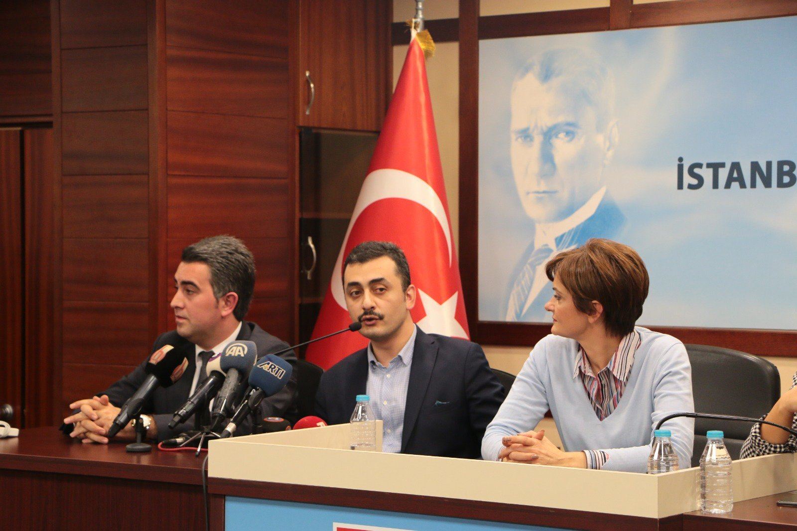 Newly released Eren Erdem [middle] sits alongside lawyer Onur Cingil [left] and CHP Istanbul head Canan Kafrancioglu [right] on November 1, 2019. Photo: CHP