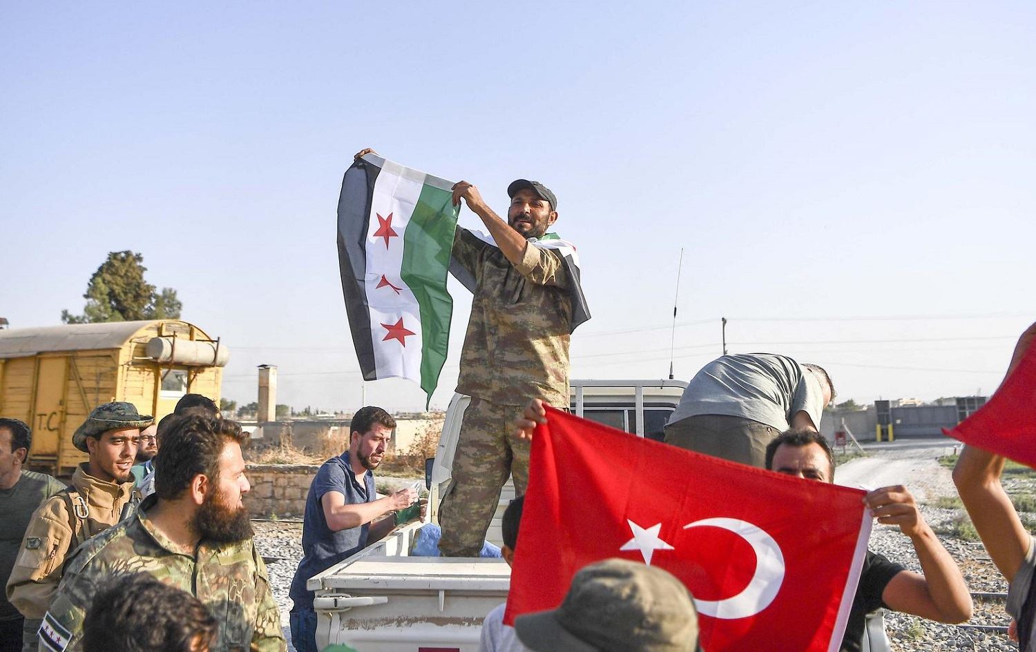 Fighters of the Turkish-backed Syrian National Army enter the town of Gire Spi (Tal Abyad). Photo: AP