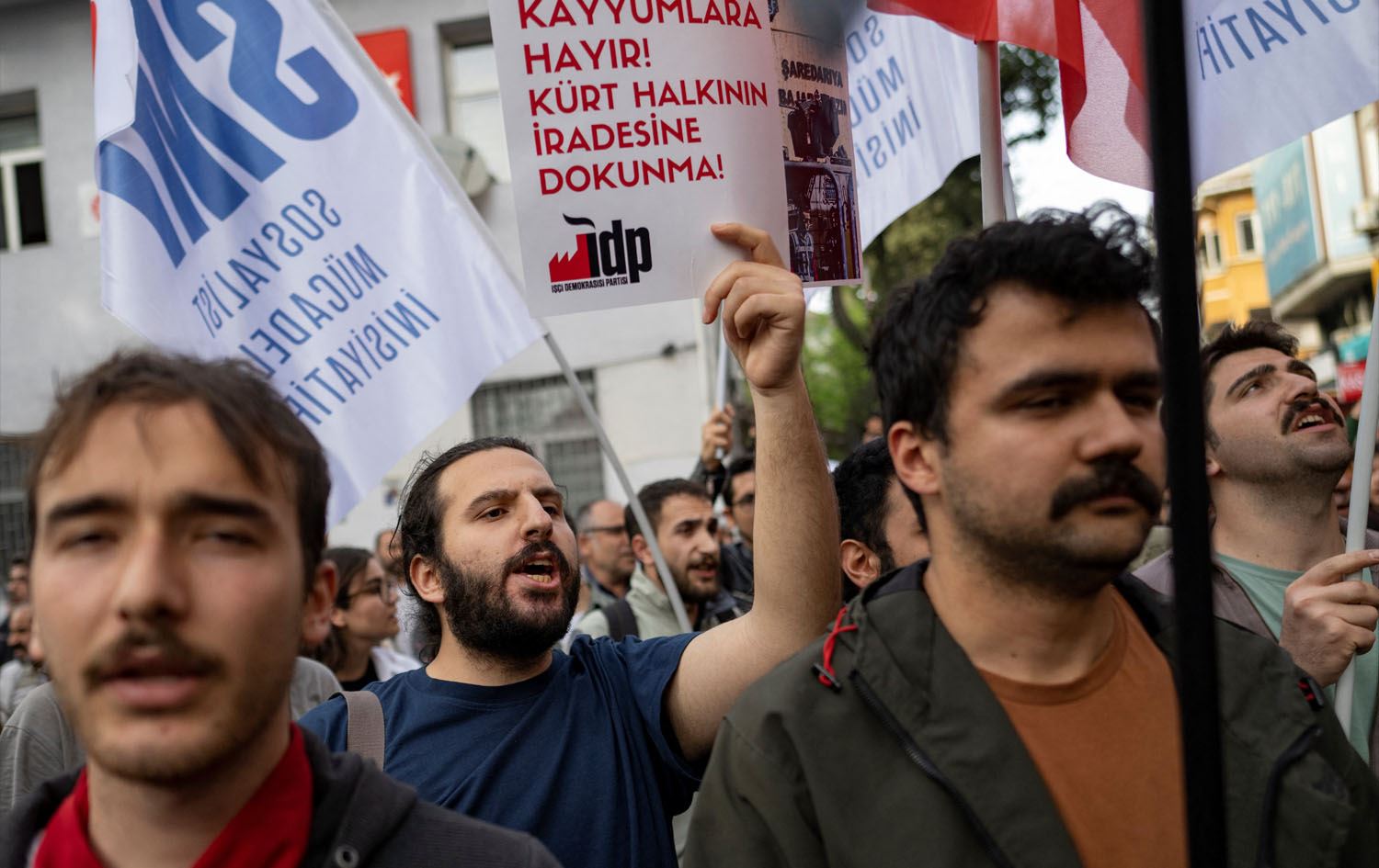 Supporters of pro-Kurdish Peoples' Equality and Democracy Party (DEM Party) take part in a demonstration after the party's Van candidate in Sunday's local elections was ruled ineligible at the last minute, in Istanbul on April 2, 2024. Photo: YASIN AKGUL / AFP
