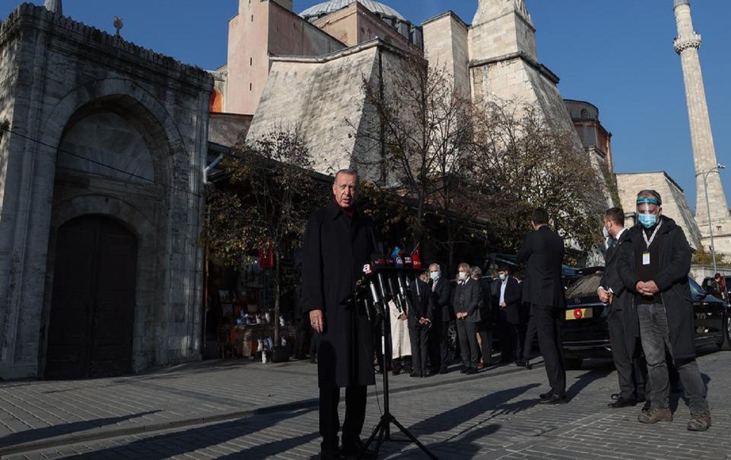 Turkish President Erdogan giving a speech after Friday prayers at the Hagia Sophia in Istanbul on December 04, 2020. Photo: TRT